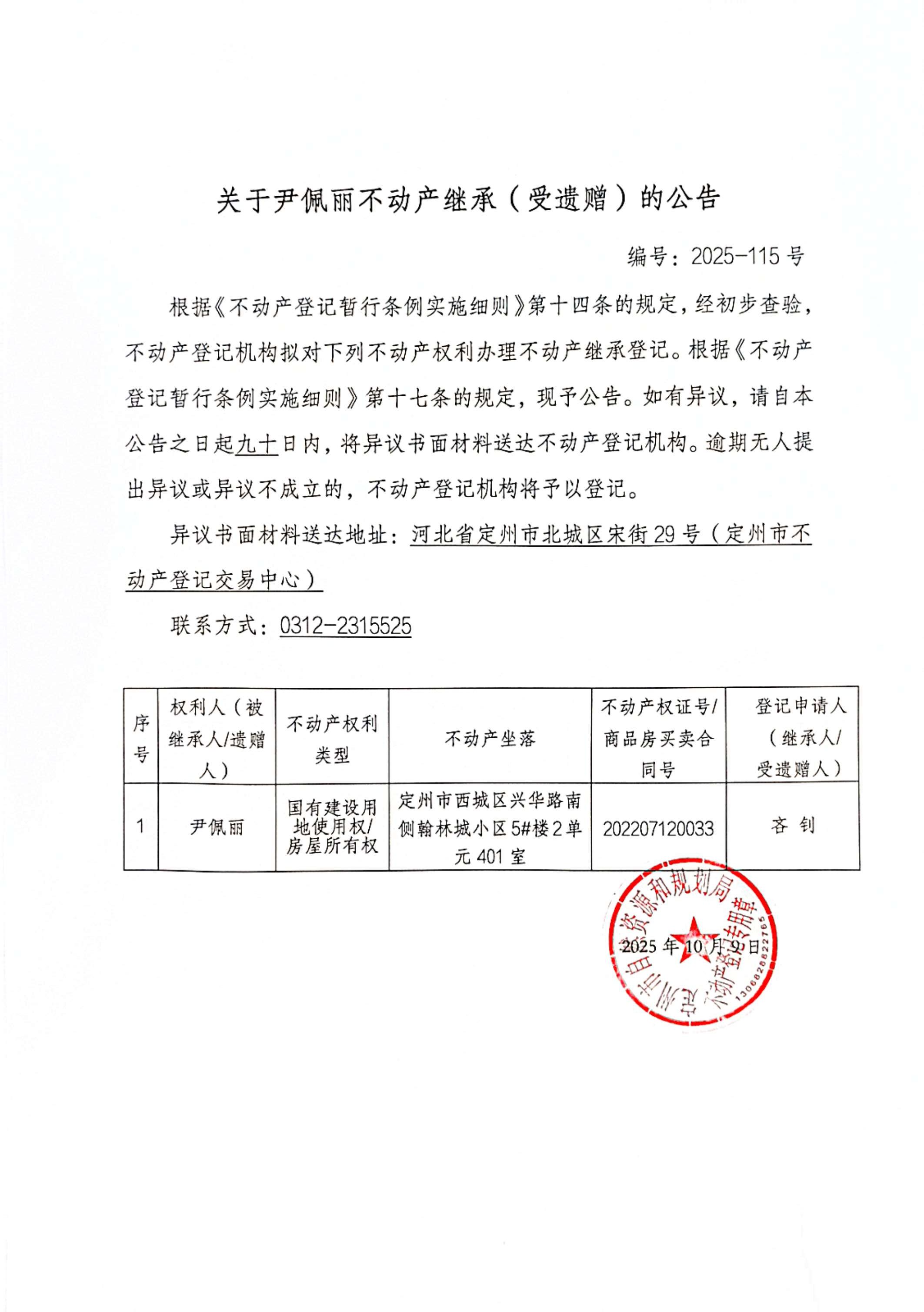 關(guān)于尹佩麗不動(dòng)產(chǎn)繼承(受遺贈(zèng))的公告