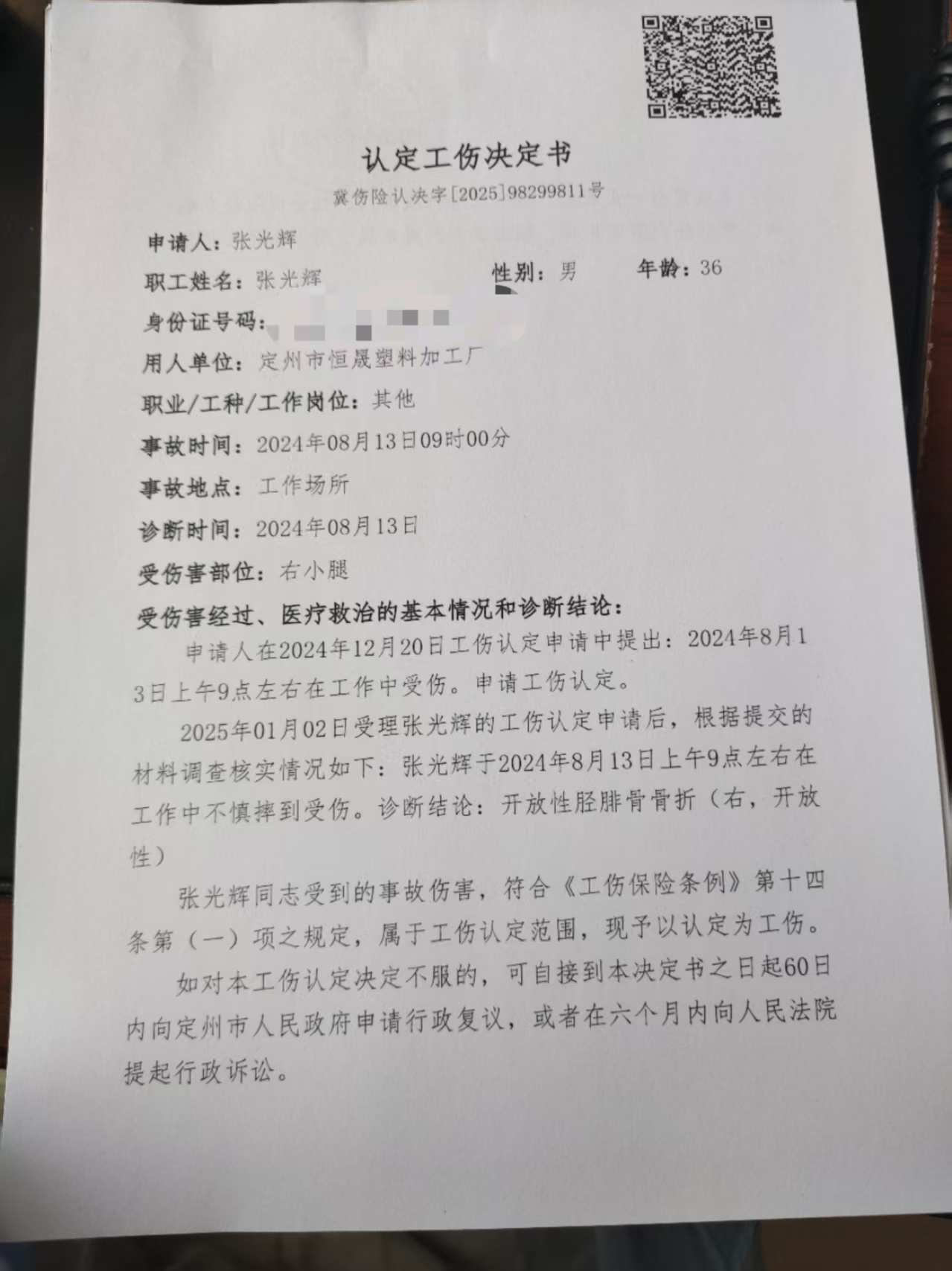 張光輝認(rèn)定工傷決定書(shū)