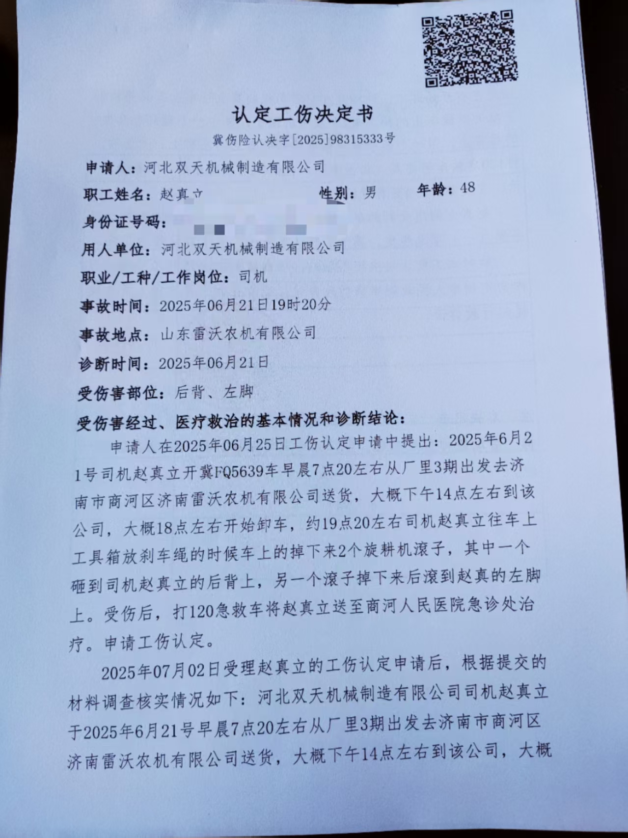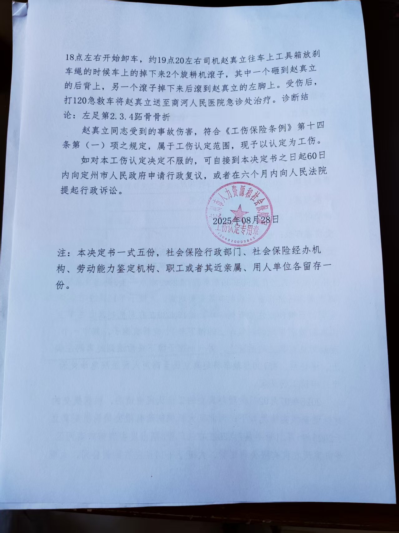 趙真立認(rèn)定工傷決定書