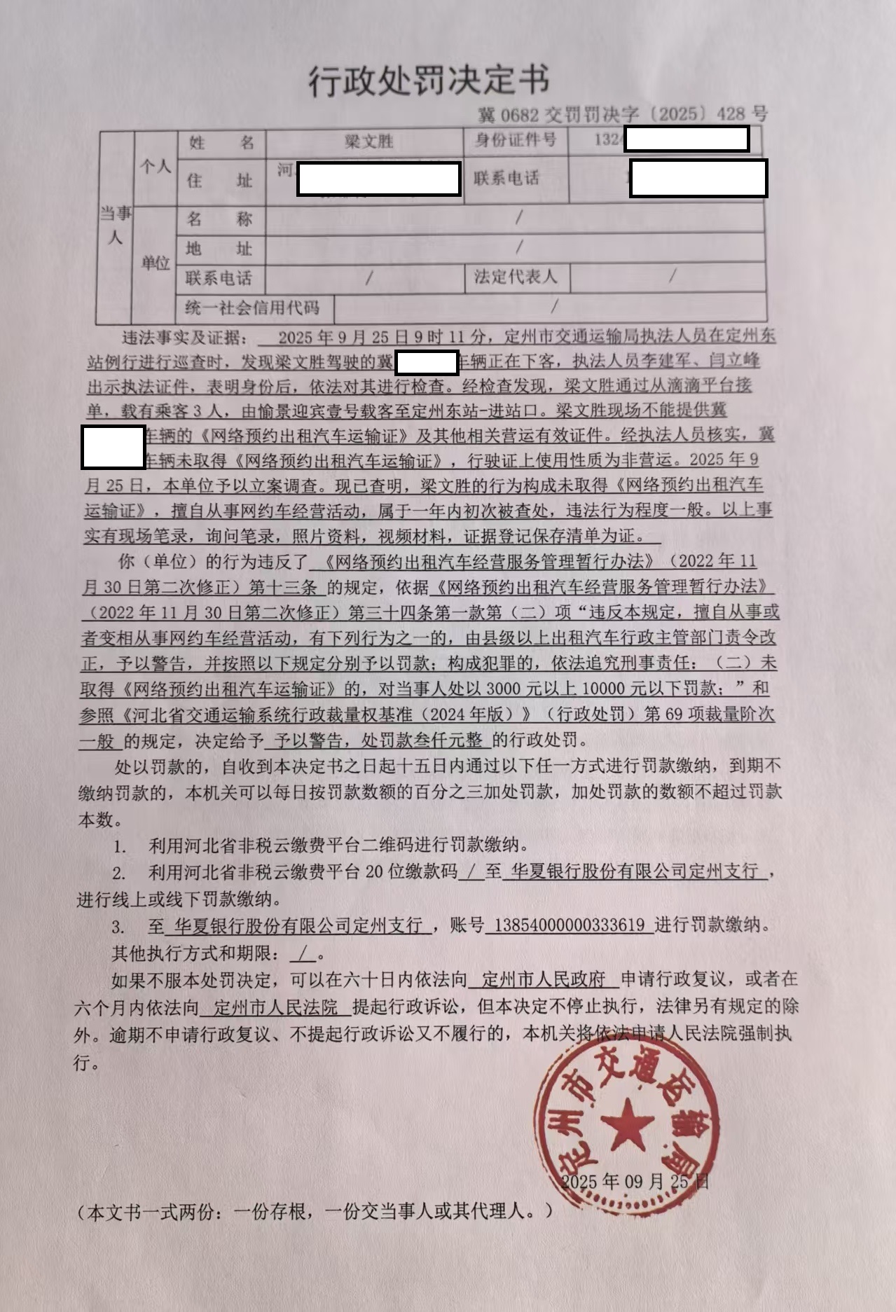 定州市交通運輸局行政處罰決定書冀0682交罰罰決字〔2025〕428號