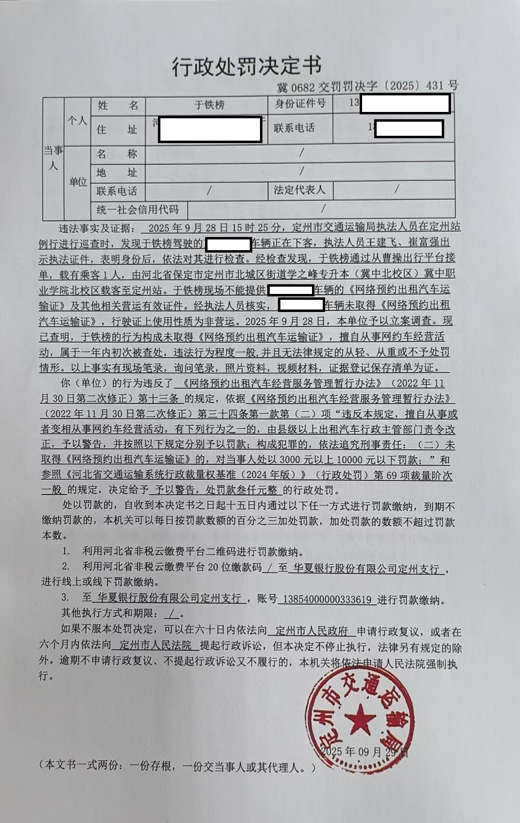 定州市交通運輸局行政處罰決定書冀0682交罰罰決字〔2025〕431號